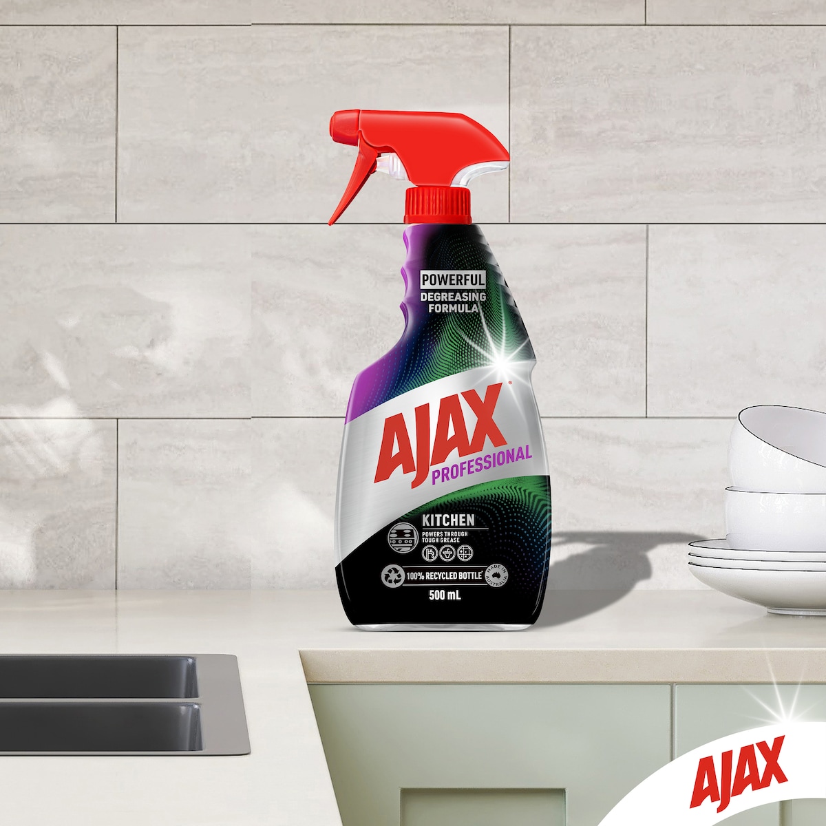 Ajax Professional Kitchen Cleaner is a Power Degreaser Trigger Surface Spray; Made in Australia with a 100% recycled bottle. Ajax Professional Kitchen has a fast acting formula that dissolves tough baked on grease, whilst cutting through dirt and grime.