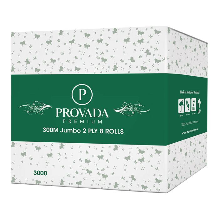 Sold in convenient cartons of 8 rolls, the Provada Premium 2ply 300 metre Jumbo Toilet Rolls x 8 rolls are the ideal solution for maintaining cleanliness and hygiene in high-traffic areas. Make the smart choice for your facility today! Reorder Code: 3000.